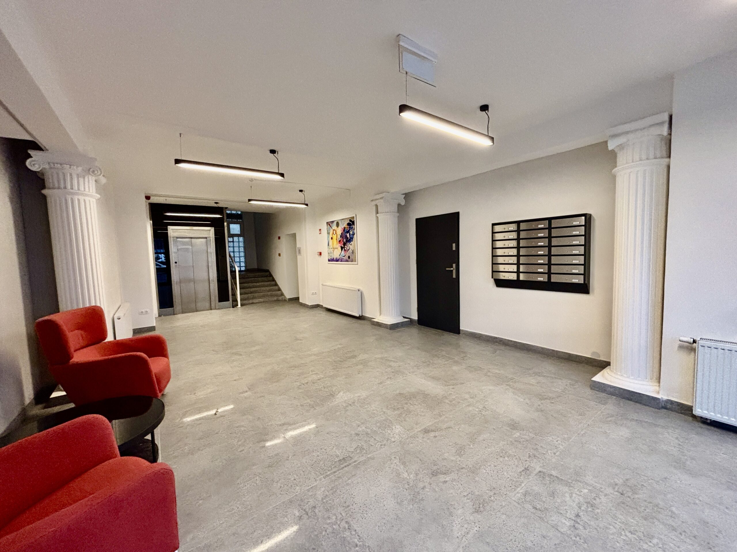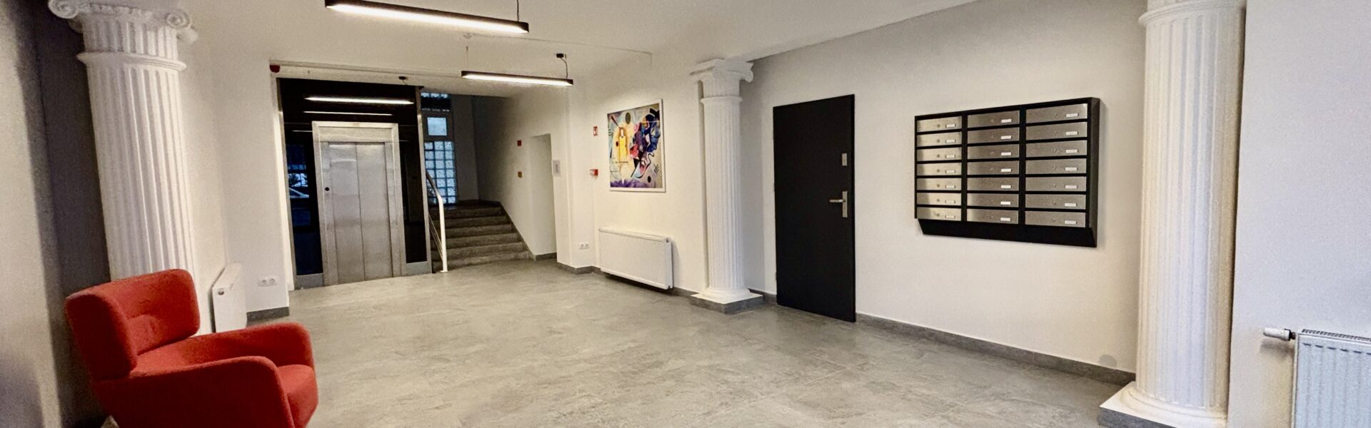 Modern fogadótér: A társasház teljes körű felújításon esett át, az aula és a közös terek stílusa a modern szállodák hangulatát idézi.
